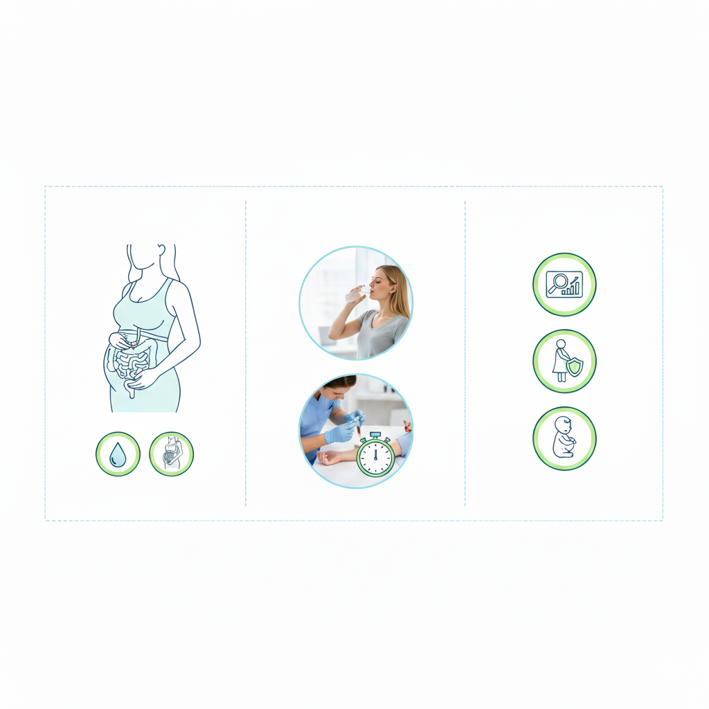 - Glukoz içimi: 75 gram glukoz, 250-300 ml suda çözülür ve 5 dakika içinde içilir.